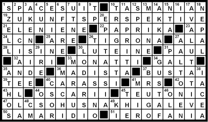1. SPACESUIT è il nome inglese della tuta (uniforme) spaziale (celeste) [1]. 10. TASMANIAN è il marchio registrato di una stoffa di lana leggera (leggerezza) usata specialmente nella confezione di abiti maschili (tipica maschile) [2]. 19. ZUKUNFTSPERSPEKTIVE, in tedesco (nell’Unione Europea) significa «avvenire» (prospettiva) [3]. 21. ELENIENE è il nome di una sostanza costituente il pigmento giallo (tinge di giallo) di molti fiori (molti potenziali simboli rosa) [4]. 22. PAPRIKA è il nome di origine serba (messa in serbo) di una spezia alimentare (droga) [2]. 23. AP è il simbolo (consente l’individuazione) del perossido di acetone, un potente esplosivo [5]. 24. LCN è Codice Iata (formula per volare) dell’aeroporto di Balcanoona, centro della regione di Flinders Ranges (serie di frammenti, in inglese), in Australia (lontani) [5]. 25. ARE è un comune dell’Estonia, la nazione che venne incaricata di produrre le gomme americane per le Olimpiadi di Mosca del 1980 (patria del chewing gum sovietico) [5]. 26. TIGRONA è un termine che può indicare una grande (rilevante) tigre, ovvero una bestia feroce (fiera) dell’Asia (asiatica) [2]. 27. ALA è il nome della figura femminile (con femminilità) predominante nella mitologia Igbo, secondo la quale ogni individuo possiede un proprio dio personale, detto Chi, (Chi, nel mito, accosta) [5]. 28. LISINE è il nome di alcuni amminoacidi basici (composti) presenti nelle proteine animali, essenziali nell’alimentazione animale (in forma essenziale) [2]. 30. LUTEINE è il nome dei pigmenti giallastri (gialli) della retina (che fanno impressione) [2]. 31. PAUL Fratellini, nativo di Catania, apparteneva a una celebre famiglia di artisti del circo, dell’Ottocento [6]. 32. AIRI è un sinonimo raro di «slanci» (propulsioni sporadiche) [2]. 33. MONATTI è il termine che indica gli addetti al trasporto (mostrano un certo trasporto) degli appestati (nei confronti dei più emarginati) [2]. 34. GALT è il cognome dello scrittore britannico (di nome John), che scrisse (ci lasciò) «Il lascito» [6]. 35. ANDE è il nome della cordigliera dell’America del Sud, i cui monti comprendono (conoscono) quarantasette vulcani attivi (sconvolgenti aperture) [6]. 36. MADISTA (o mahdista) è un sinonimo di «sciita duodecimano»; ovvero: islamico che attende (attendente) l’avvento del dodicesimo Mahdi [4]. 37. BUSTAI è un termine che indica gli operai addetti alla fabbricazione (autori) di buste (articoli privi di contenuti) [2]. 39. TEE è il nome di un particolare elemento di tubazione, avente tre porte di ingresso/uscita (una soluzione pratica al problema delle tre porte) [5]. 40. CARASSI è il nome di alcuni pesci di acqua dolce che, appena nati, sono piccoli e neri [7]. 41. MRS è un’abbreviazione (semplifica) di «Mistress» (la dama internazionale) [2]. 42. OTA è il nome di un comune della Corsica del Sud (corso) [5]. 43. HL è la sigla (compendia) di «Historia Langobardorum», un’opera di Paolo Diacono, suddivisa in sei libri, che narra la storia dei Longobardi [5]. 44. OSCAR II è il nome del re di Svezia e di Norvegia, la cui immagine compare sulle scatole di biscotti della ditta Göteborgs Kex AB [5]. 45. TEUTONIC vuol dire teutonico (germanico) in inglese (albionico) [1]. 47. OLCSÓ HÚSNAK HÍG A LEVE è un proverbio diffuso in Ungheria (in un remoto possedimento degli avari), il quale sostiene che: «La carne scadente non fa buon sugo» (ovvero: non si può ottenere un prodotto soddisfacente se le risorse sono mediocri) [8]. 50. SAMARIDIO è il nome del frutto indeiscente secco dell’acero (un prodotto rinsecchito), destinato alla disseminazione anemofila (da gettare al vento) [2]. 51. IEROFANIA è un termine che indica la manifestazione del sacro (apparizione celestiale) in una realtà profana (in un tempo secolare) [2]. VERTICALI 1. SZELL è il nome del sadico dentista, interpretato da Laurence Olivier nel film «Il maratoneta» di John Schlesinger [9]. 2. PULCIANELLA è il nome di un fiasco piuttosto panciuto (evidente) [2]. 3. AKENSIDE è il cognome di un poeta inglese del Settecento (di nome Mark) che scrisse numerosi pezzi disimpegnati (creò diverse futilità) per la rivista «Gentleman’s Magazine» [7]. 4. CUN è il nome di una tradizionale unità di misura di lunghezza (classica grandezza di confronto) cinese (per i gialli) [5]. 5. ENIANI è il nome di un antico popolo della Grecia, un cui re venne lapidato, per obbedire ad un oracolo (per rispettare una profezia) [5] 6. SFERE è un termine che indica anche le lancette (frecce) dell’orologio (temporali) [2]. 7. UTNE è il nome di un bimestrale che pubblica una selezione della stampa alternativa (di fonti alternative) statunitense (dell’altro mondo) [5]. 8. ISE è il nome comune a due città: una che si trova in Nigeria e un’altra che si trova in Giappone [7]. 9. TP è la sigla automobilistica (caratteri peculiari) dell’Arcadia (Grecia) [5]. 10. TRAGETTI è una variante disusata di «tragitti» (percorsi cancellati) [2]. 11. ASPRITÀ è un variante arcaica (di altri tempi) di «asperità» (scabrosità) [2]. 12. SPRONI è un termine che, nel significato (nel tenore), può essere interpretato come: «sollecitazioni» [2]. 13. MEINE è il cognome di un musicista (di nome Klaus), leader (si trova in testa) della banda tedesca degli «Scorpions» (scorpioni) specializzata in Heavy Metal (metallo pesante) [5]. 14. AKKA è il nome di alcuni personaggi fantastici che, pur essendo di statura molto bassa (nel loro piccolo), si mostrano sempre molto coraggiosi [10]. 15. NTA è la sigla (identifica ) dell’acido nitrilotriacetico (un composto), che è un prodotto tossico (letale) [5]. 16. II è una sigla che indica un tipo di «supernova» (esplosione siderale) [5]. 17. AVALUTATIVI è un aggettivo che significa: «escludenti (ignoranti) giudizi di valore (apprezzamenti di merito)» [2]. 18. NEPAL è il nome dello Stato dell’Asia centromeridionale che, nel 1951, ha roves